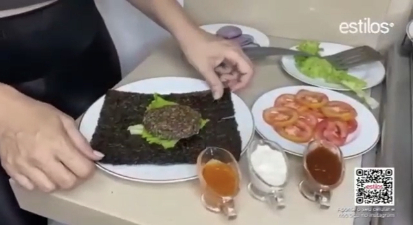Depois de pronto, embrulhei o hambúrguer e o recheio na alga marinha, mas, se você não estiver preocupado com calorias, pode usar o pão de sua preferência.